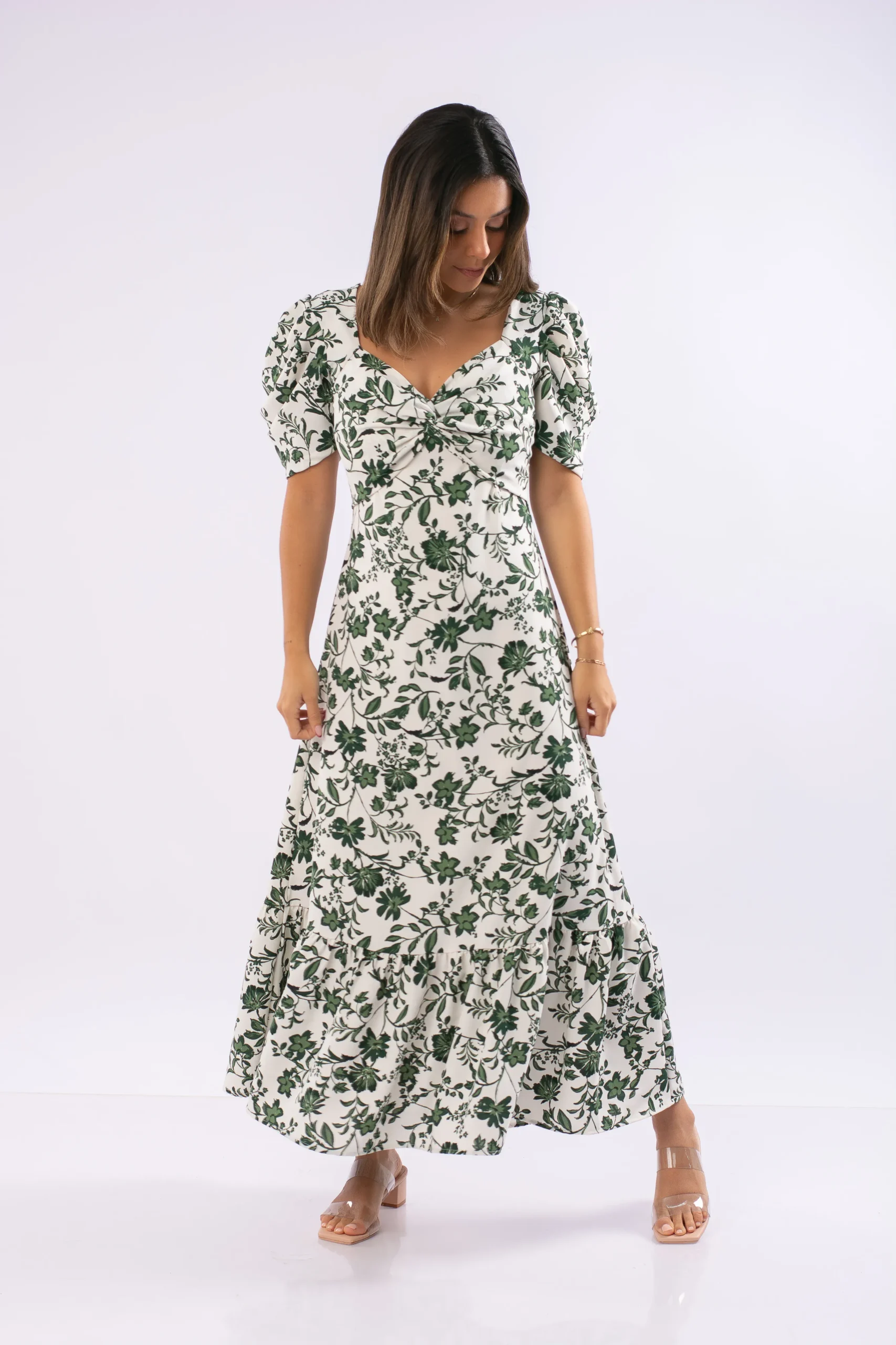 Presenta mangas abullonadas que aportan volumen y un aire romántico. Su escote tipo nudo crea un efecto tipo corazón, realzando el busto de forma sutil y dando un ajuste más ceñido en el cuerpo. Incorpora una pieza fruncida que aporta mayor vuelo y fluidez a la falda, logrando una caída hermosa al caminar.