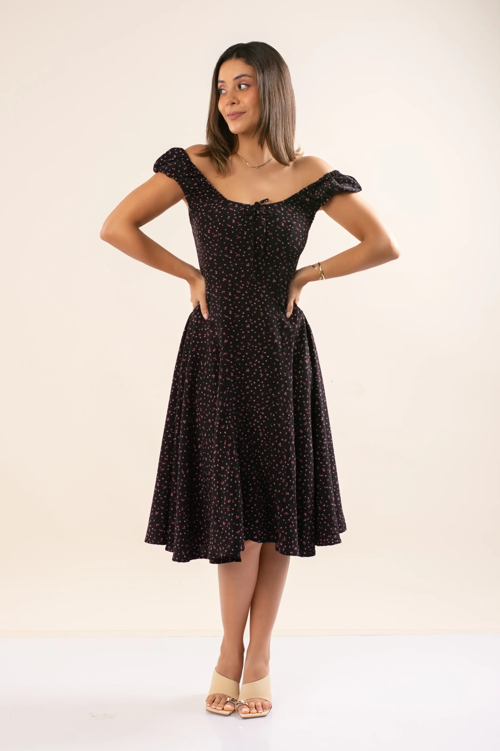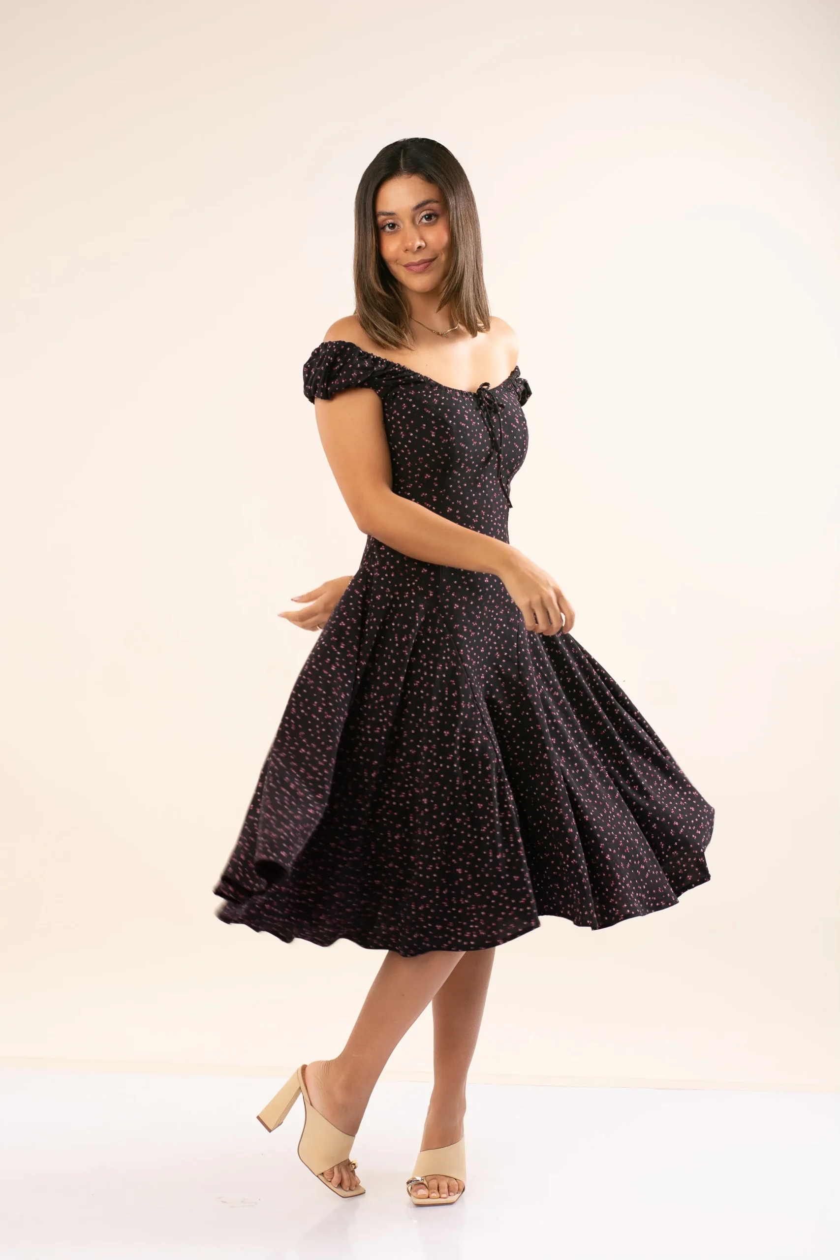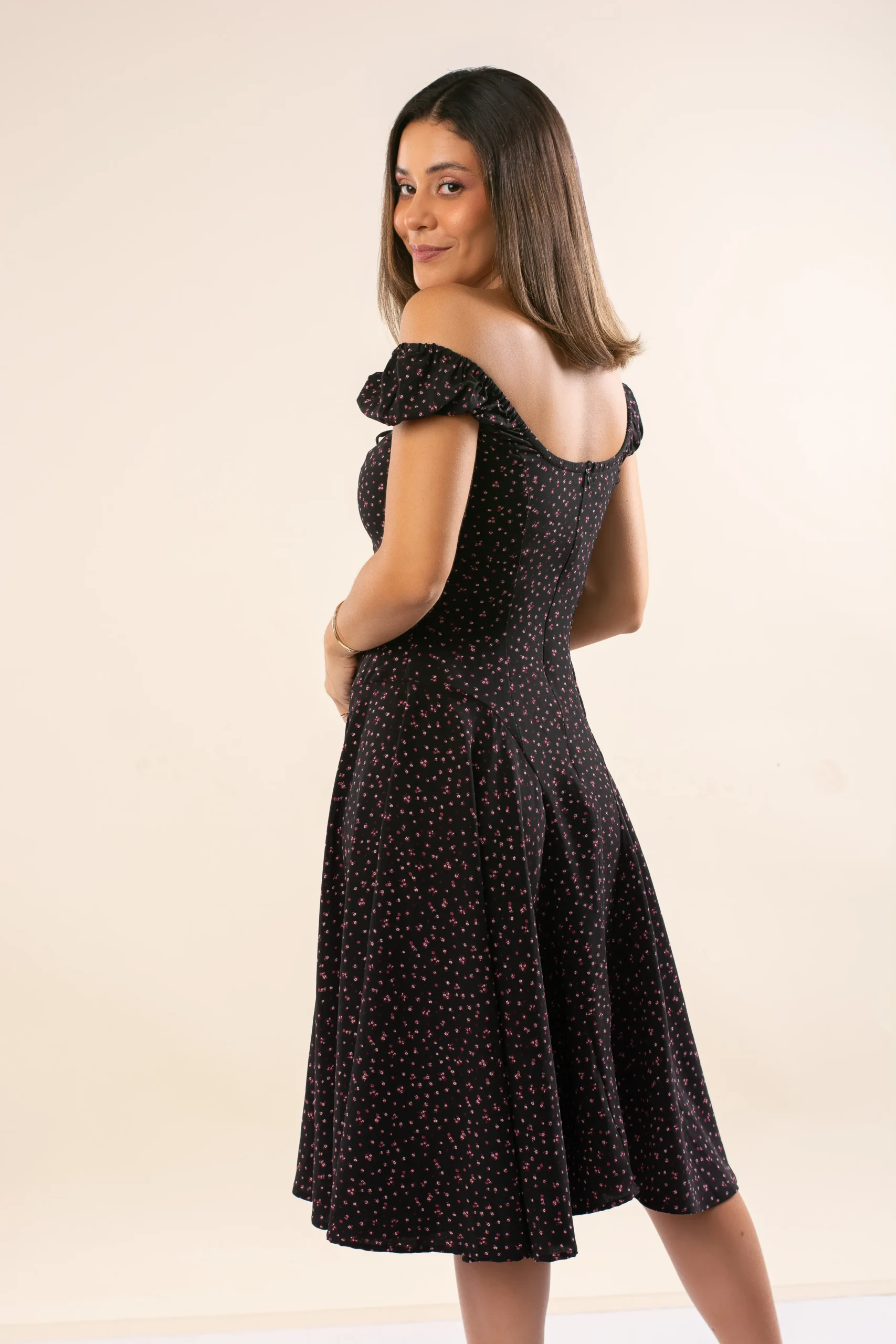 El Vestido Victoria es una pieza romántica y elegante, diseñada para destacar por su movimiento y silueta femenina. Se puede usar estilo off shoulder dejando los hombros al descubierto, aportando un toque delicado y sofisticado.
